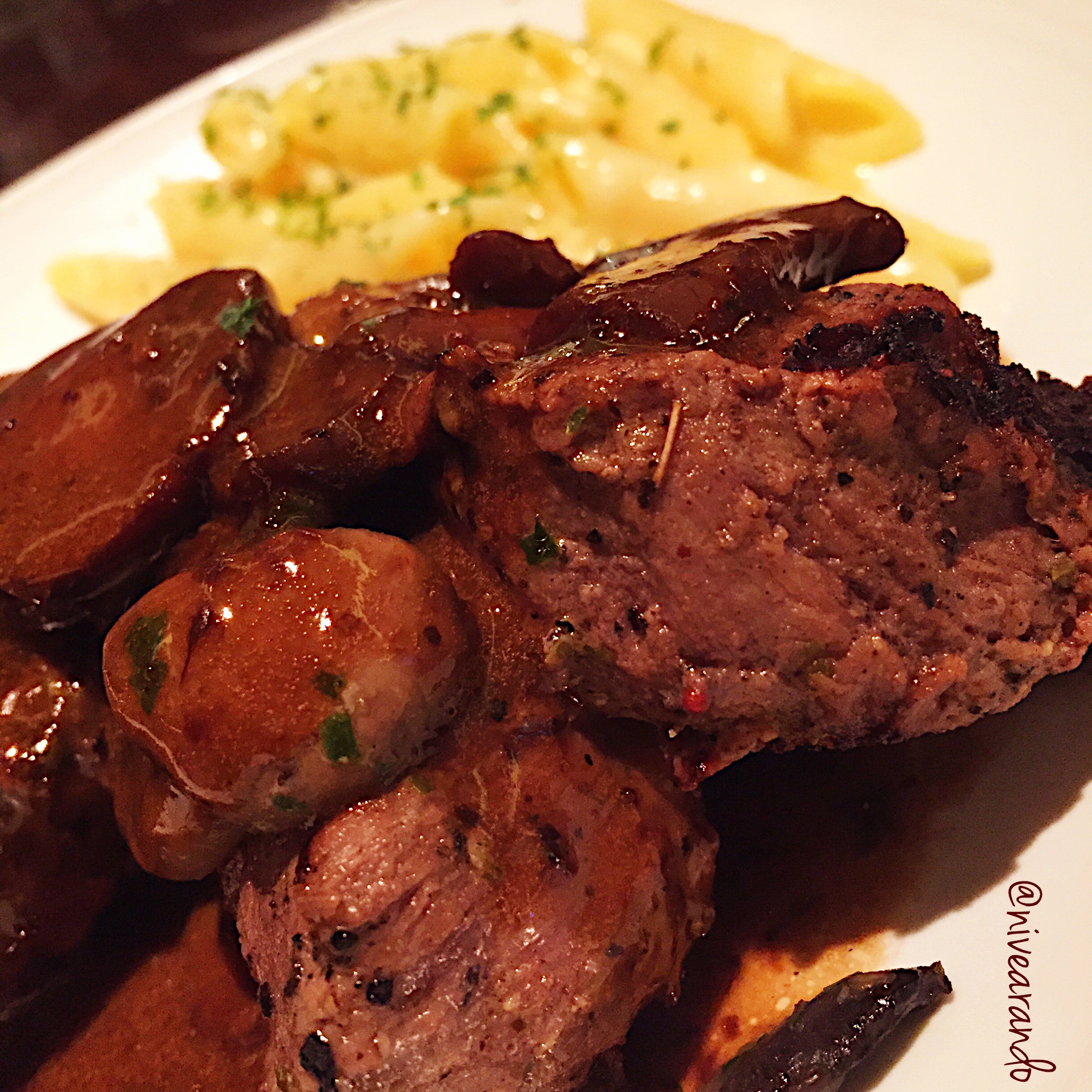 Já para os amantes de carne vermelha, sugiro o Scallopine de filet mignon grelhado, coberto com prosciutto, cogumelos e molho à base de vinho Marsala.