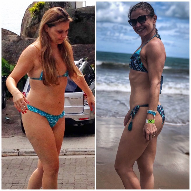 A esquerda 2015 com 55 quilos e 36% de gordura corporal. A direita Janeiro de 2018 com 53 quilos e 600 gramas e 19% de gordura corporal.